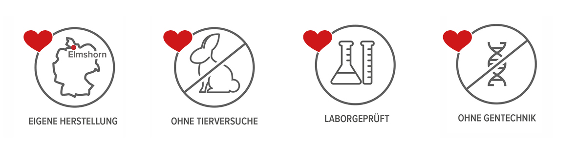 Unsere Firma verbindet Tradition mit Modernität und stellt unseren Kunden wirkungsvolle Produkte in höchster Qualität und optimaler Dosierung zur Verfügung. Unter Einhaltung strengster Qualitätsstandards durch unabhängige deutsche Labore, umfassende Qualitätssicherungsmaßnahmen in der Herstellung, kontinuierliche Qualitätskontrollen in der Fertigung und eine umfassende Expertise in der Rohstoffindustrie, garantieren wir immer die beste Produktqualität. Selbstverständlich entwickeln wir alle Produkte und Inhaltsstoffe ohne Tierversuche und ohne Gentechnik.
